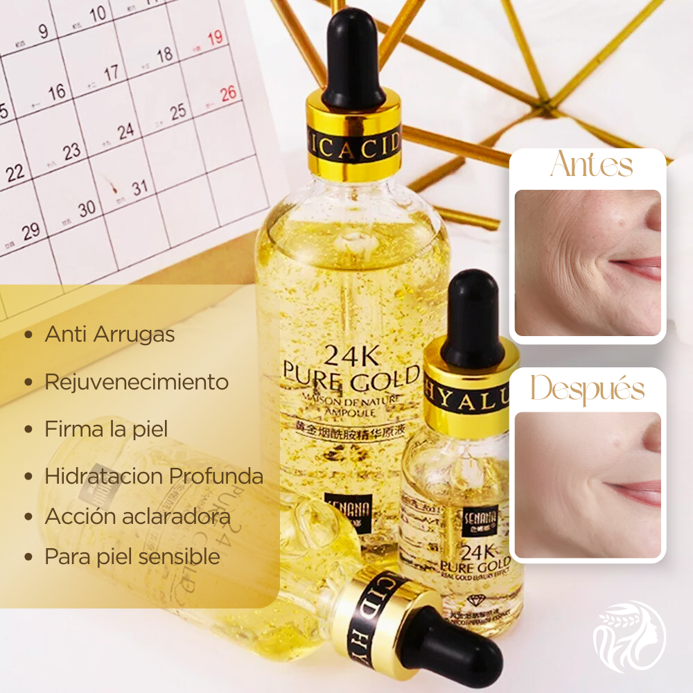 El oro de 24 quilates combinado con ácido hialurónico actúa desde las capas más profundas de la piel, promovendo la bioestimulación del colágeno, hidratando y reorganizando las células, restaurando su juventud. Estimula la producción de colágeno natural, aclara las manchas, previene la flacidez y mejora visiblemente la textura y luminosidad.