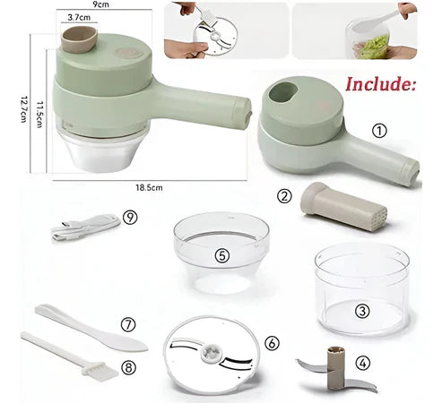 🔧 Multifuncional Todo-en-Uno: Actúa como cortador de verduras, picadora de carne y cepillo de limpieza eléctrico, ¡ahorrándote tiempo y espacio en la cocina!.